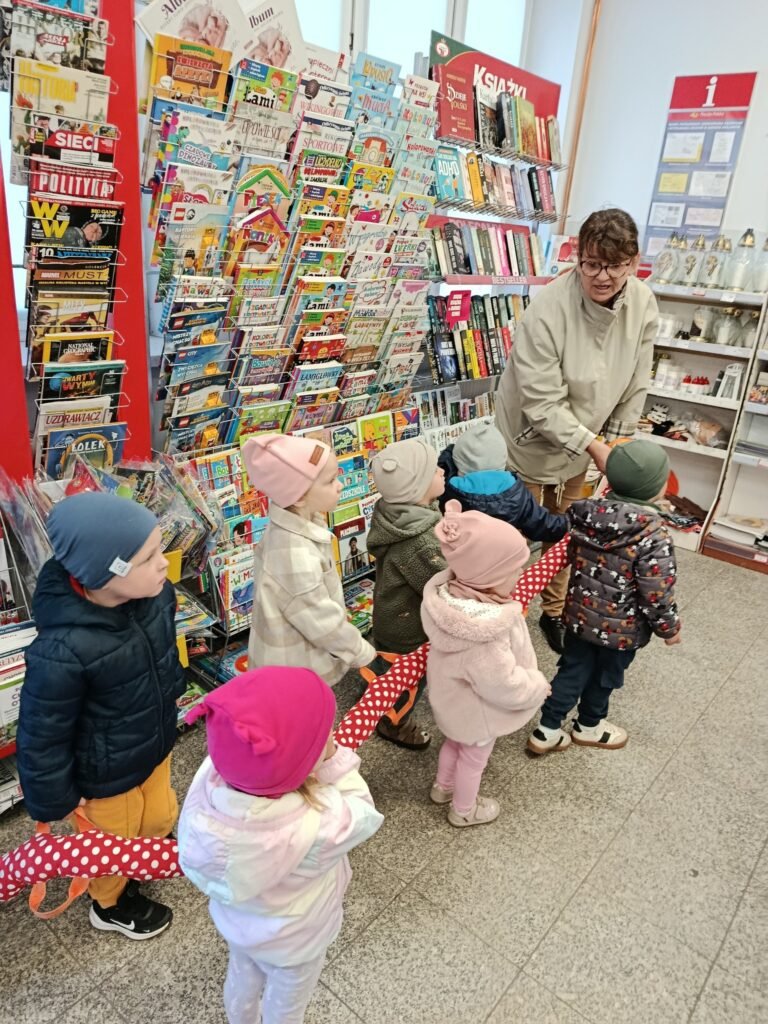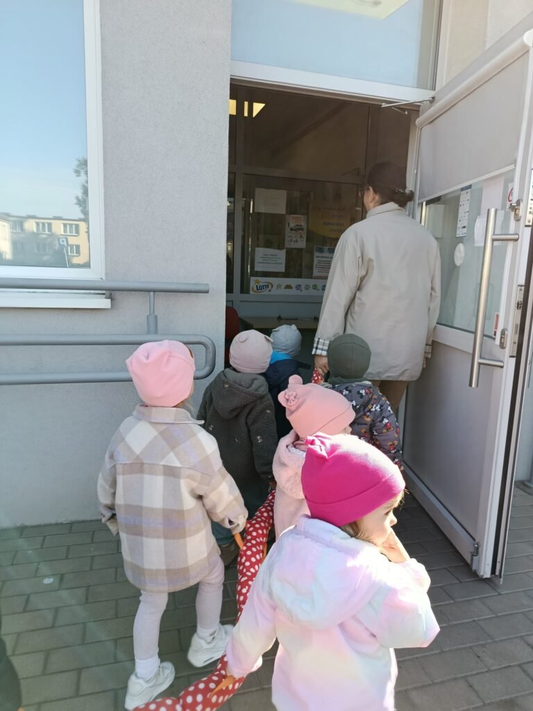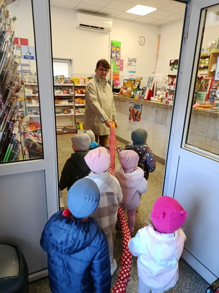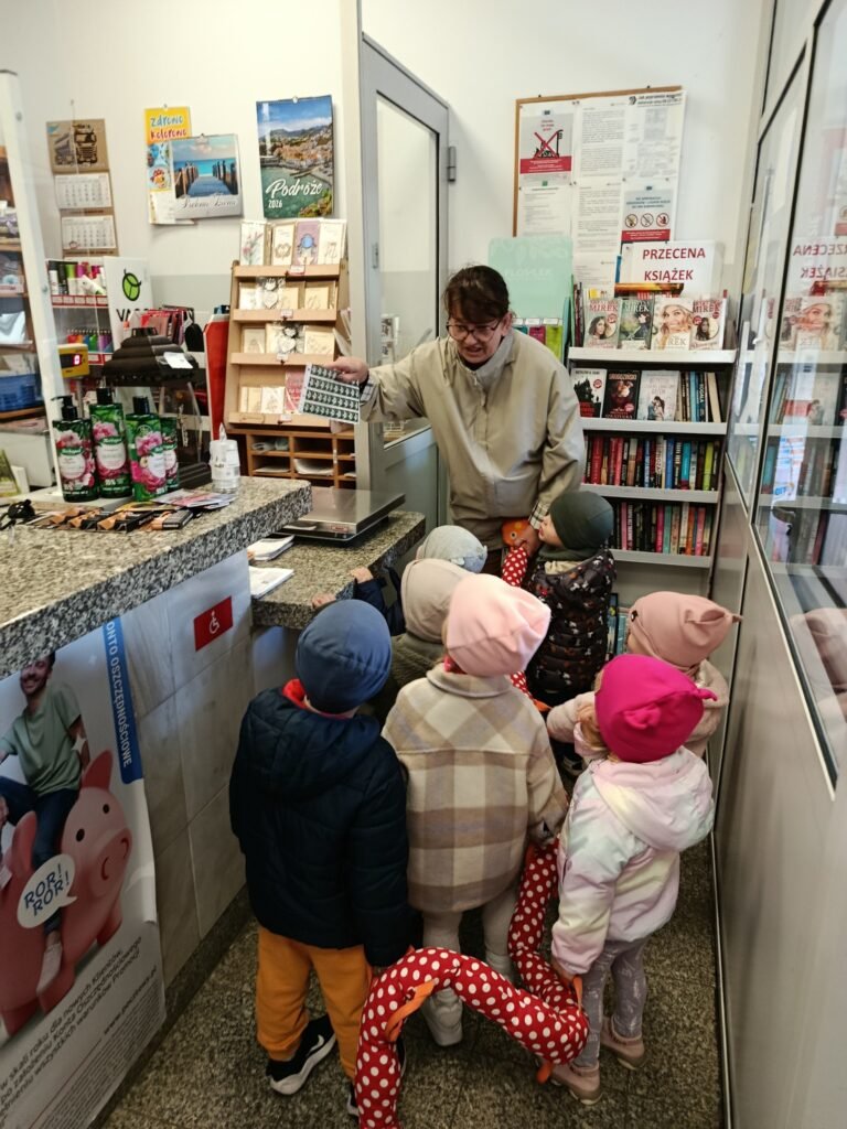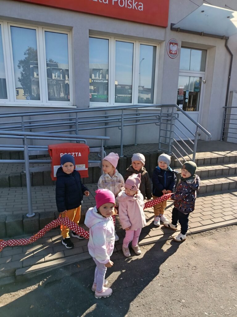 Z tej okazji udaliśmy się na spacer do Urzędu Pocztowego, aby dzieci mogły zapoznać się z jego pracą, a także zobaczyć jak wygląda prawdziwa skrzynka pocztowa i znaczek.