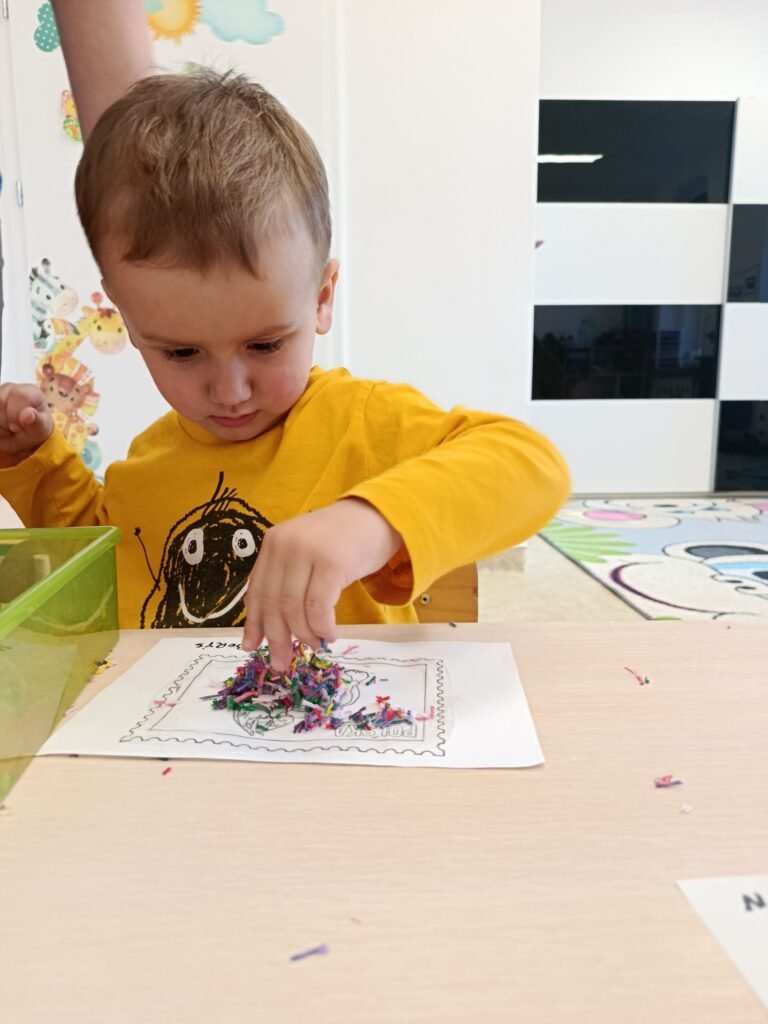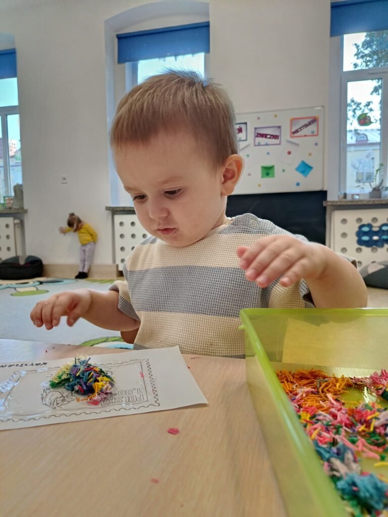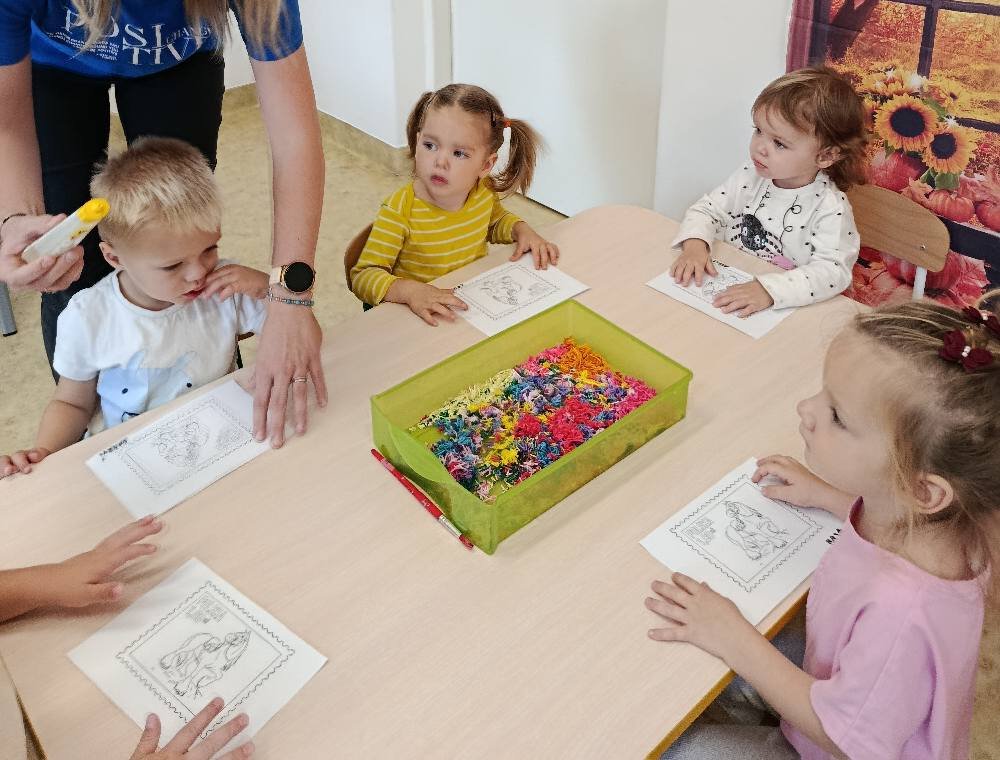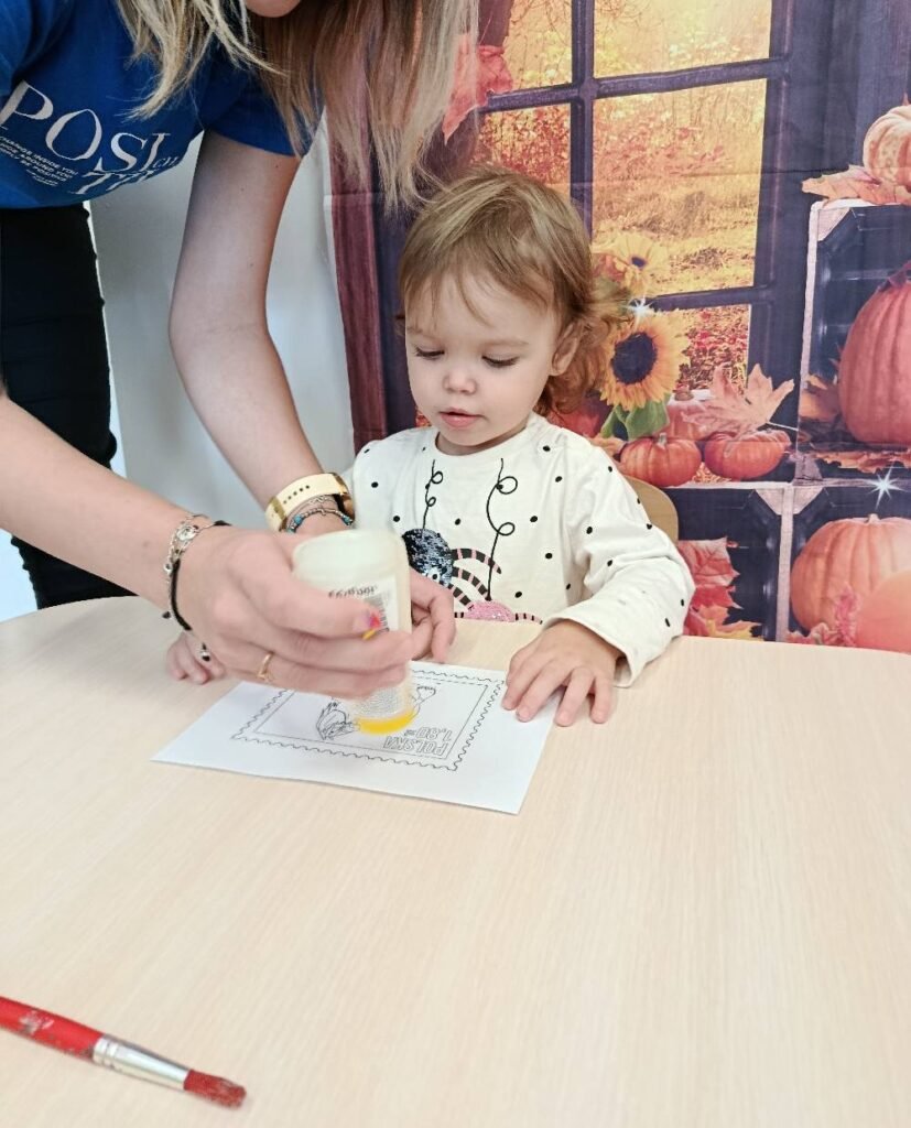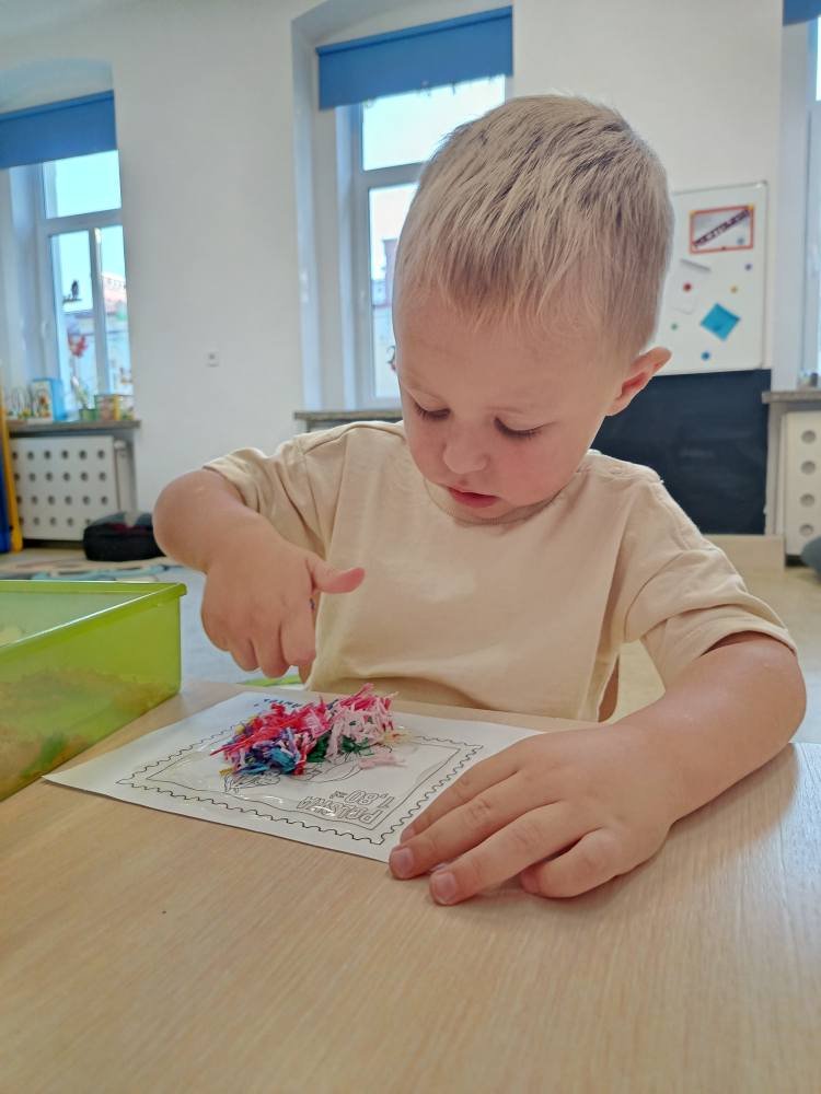 Po powrocie do żłobka dzieci stworzyły własny znaczek pocztowy ozdabiając go muliną 🦋