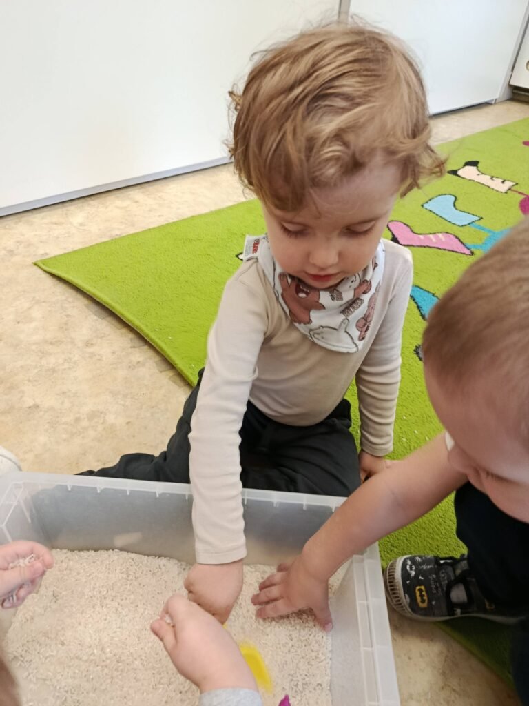Na zdjęciach widać, jak dzieci odkopują dinozaury ukryte w ryżu, używając małych łopatek i pędzelków.