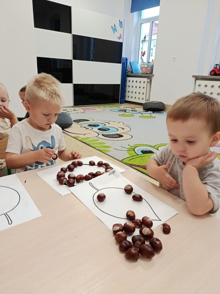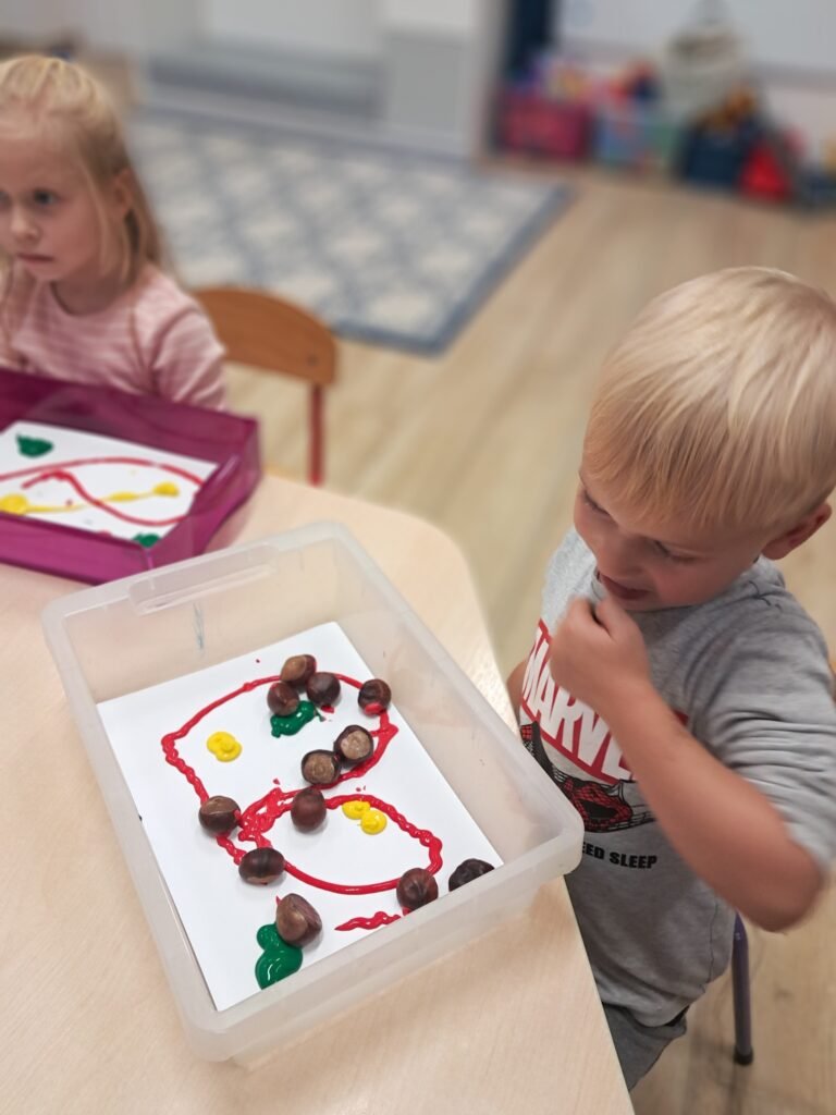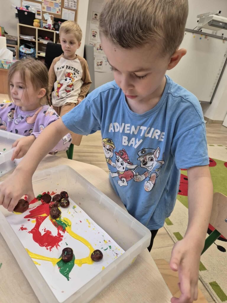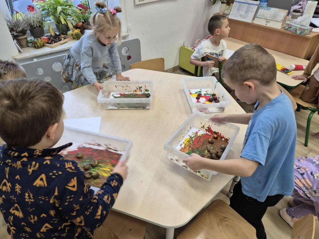 Dzieci miały okazję poeksperymentować z nietypową techniką – malowaniem kasztanami. To nie tylko świetna zabawa, ale też doskonałe ćwiczenie motoryki małej, koordynacji ręka-oko oraz rozwijanie zmysłu dotyku i kreatywności.