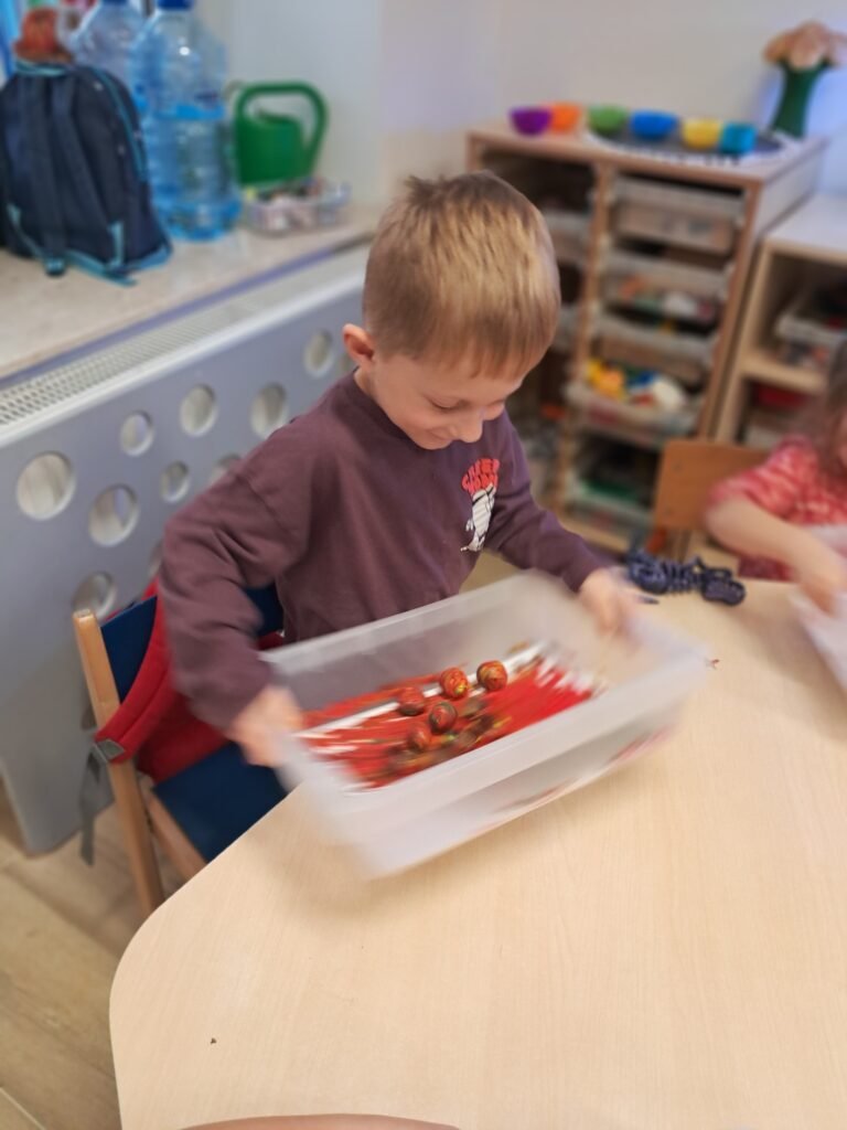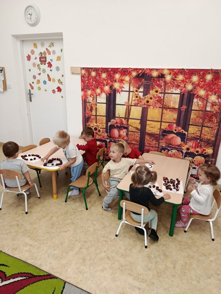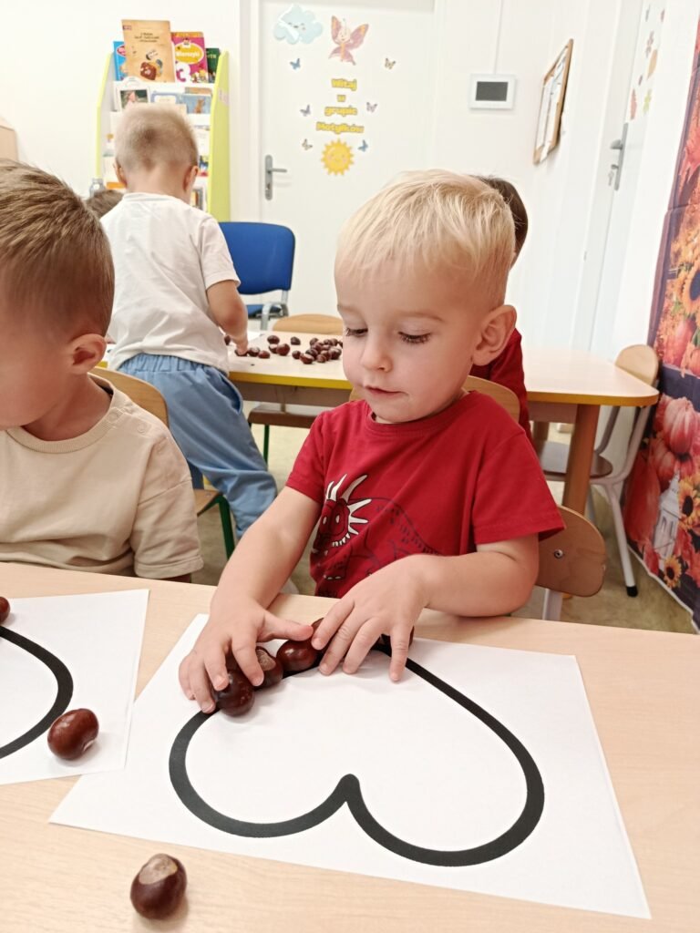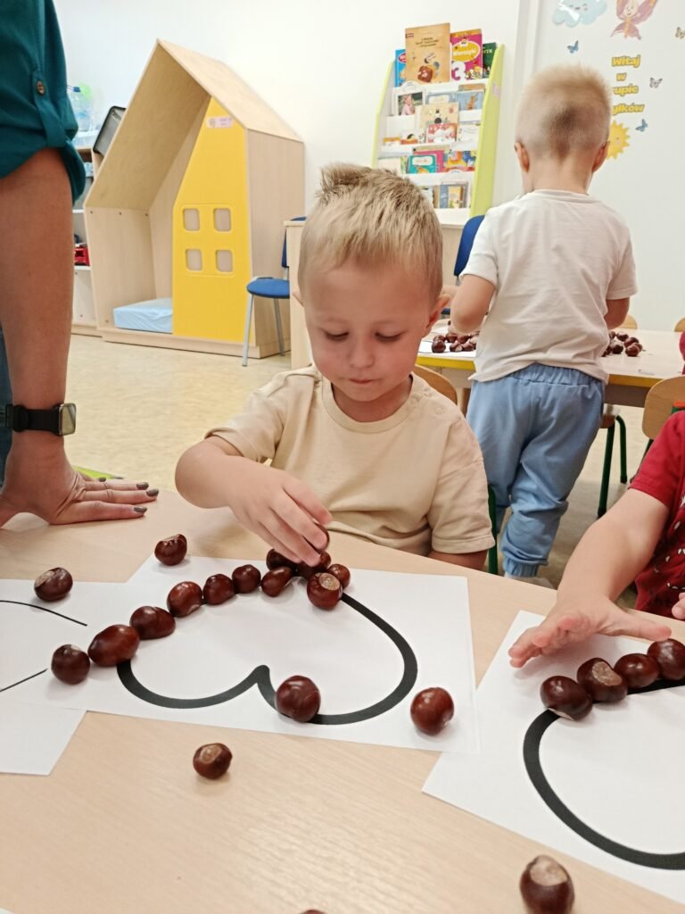 Dzieci miały okazję poeksperymentować z nietypową techniką – malowaniem kasztanami. To nie tylko świetna zabawa, ale też doskonałe ćwiczenie motoryki małej, koordynacji ręka-oko oraz rozwijanie zmysłu dotyku i kreatywności.