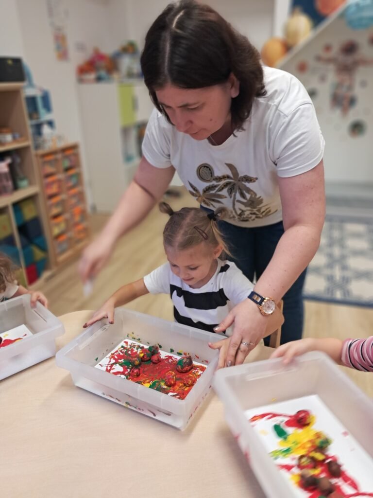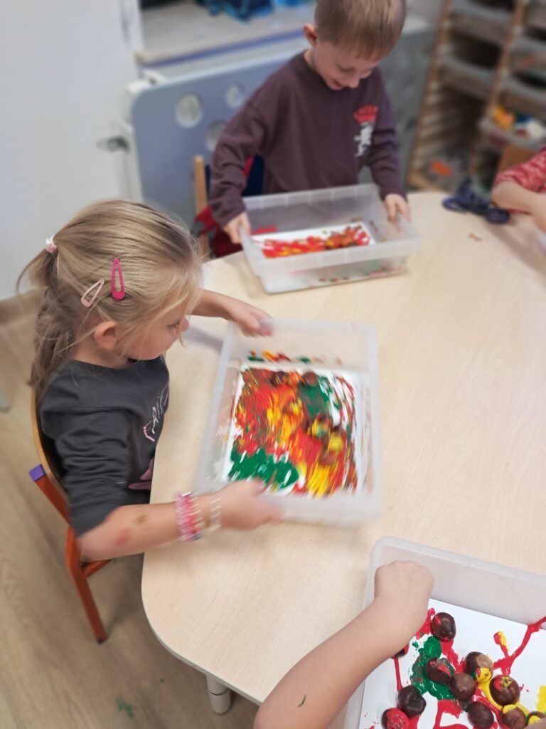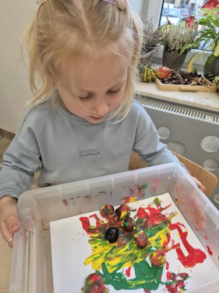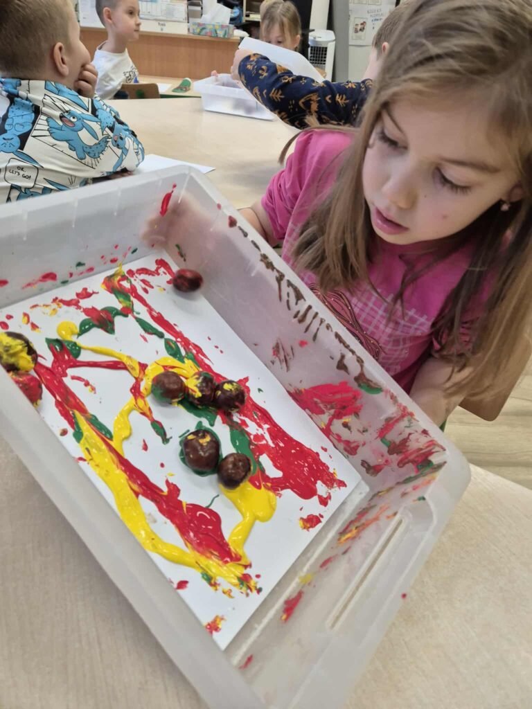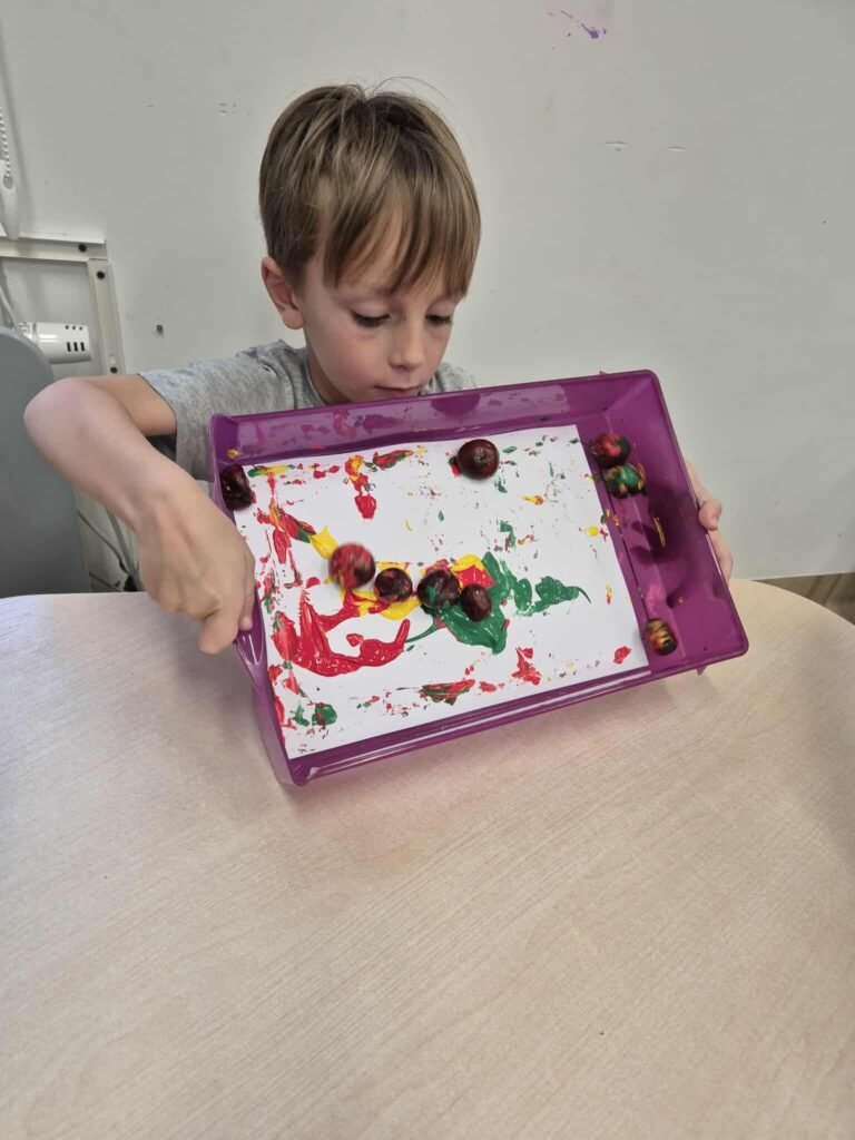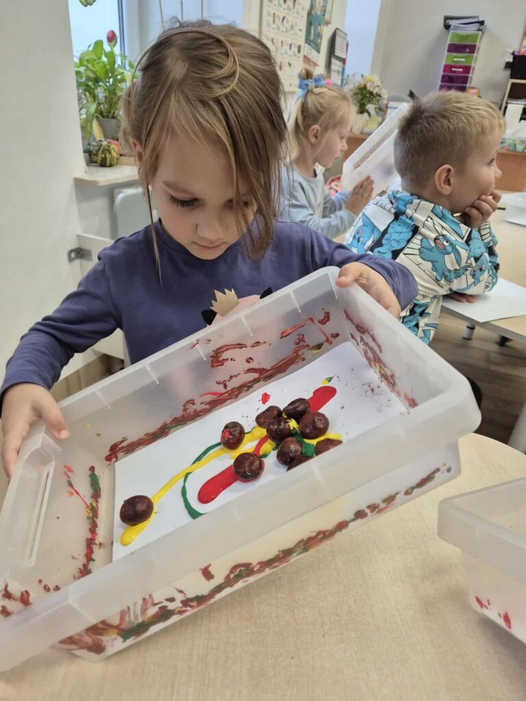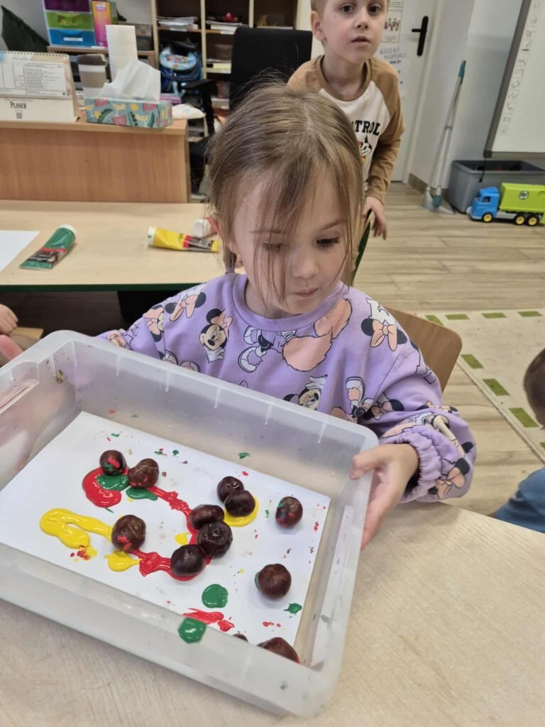 Obserwując, jak kasztany turlają się po kartkach zostawiając barwne ślady, maluchy uczyły się także cierpliwości, planowania i… że sztuka nie zna granic!