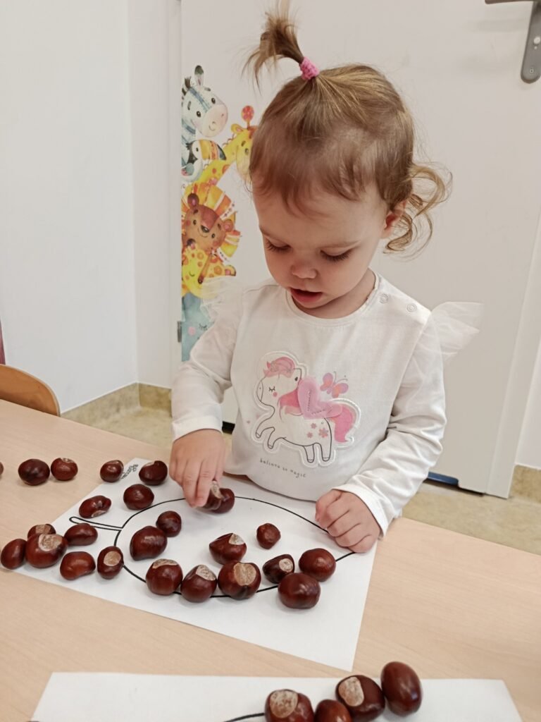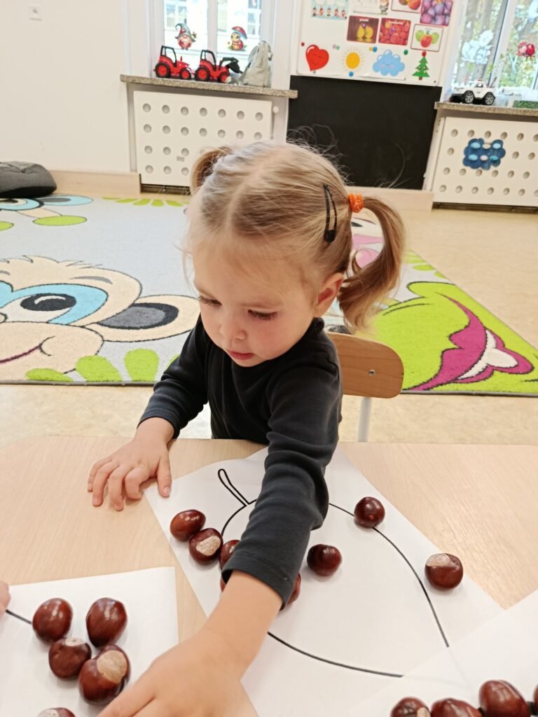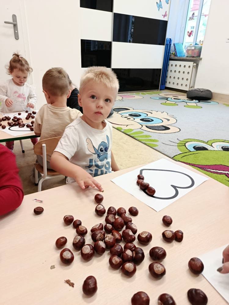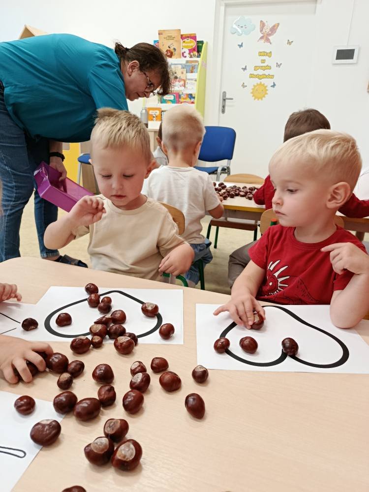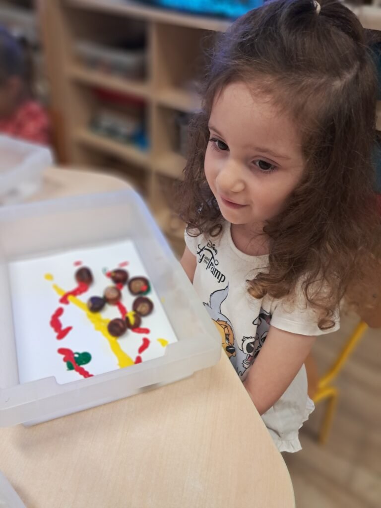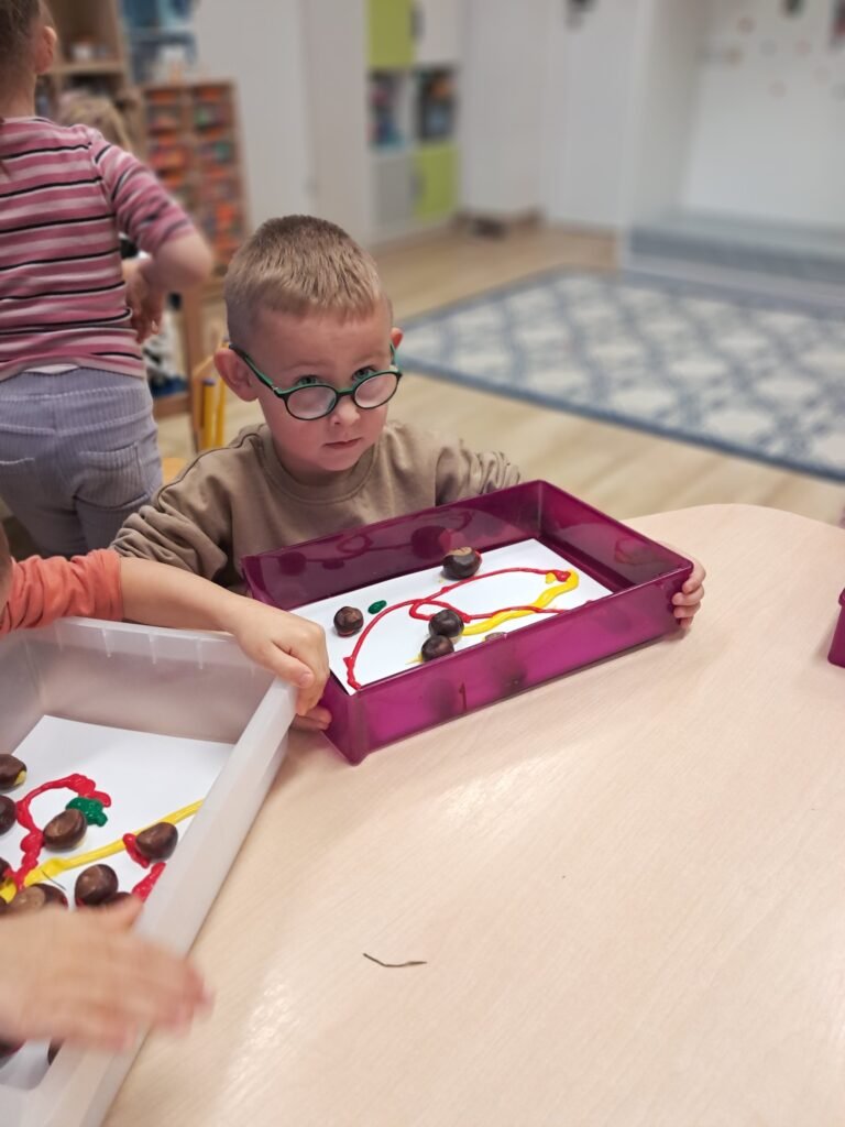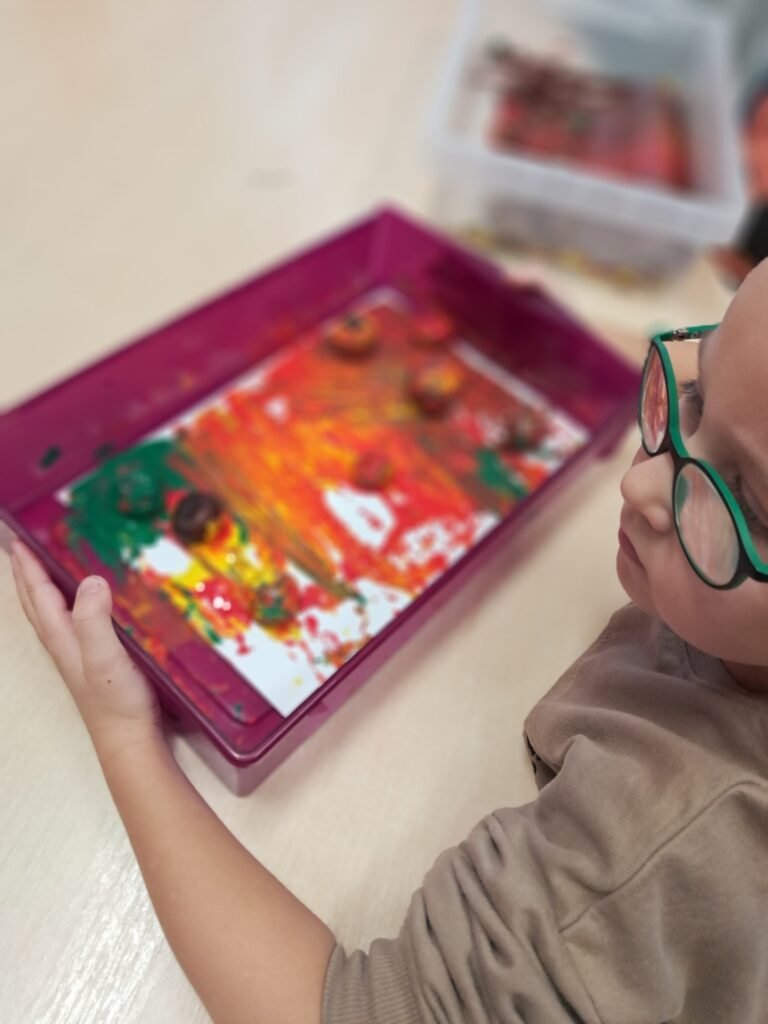 Obserwując, jak kasztany turlają się po kartkach zostawiając barwne ślady, maluchy uczyły się także cierpliwości, planowania i… że sztuka nie zna granic!