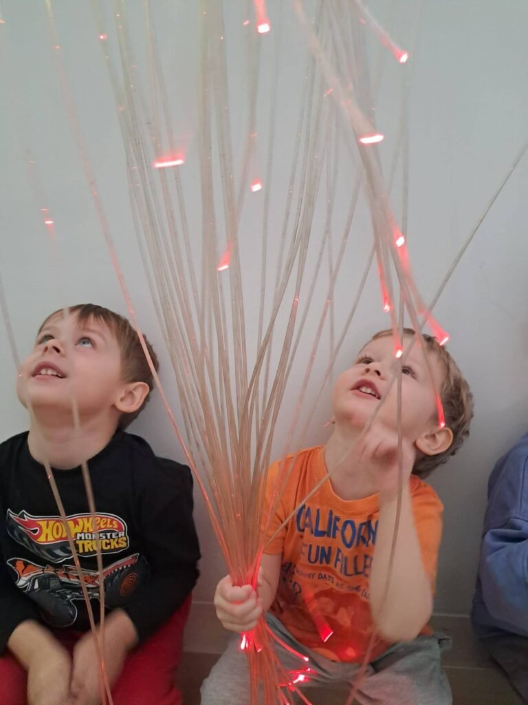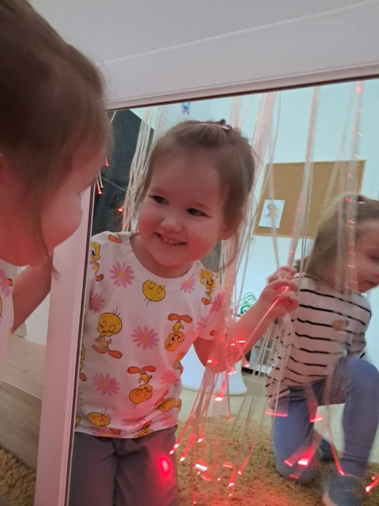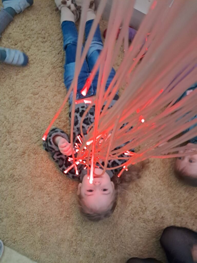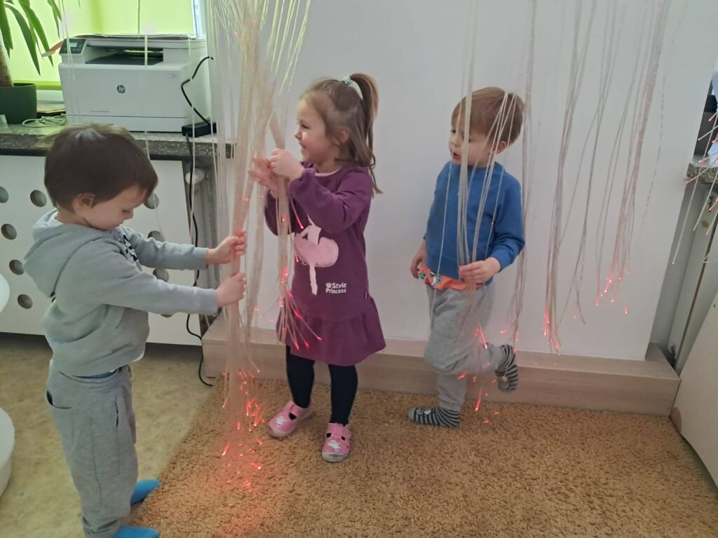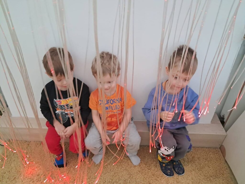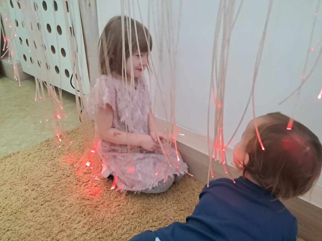 Sala Doświadczenia Świata to wyjątkowe miejsce, w którym dzieci mogą bezpiecznie odkrywać, doświadczać i rozwijać swoje zmysły. Podczas zajęć z integracji sensorycznej stymulujemy wzrok, słuch, dotyk, równowagę i czucie głębokie, wykorzystując światło, dźwięki, faktury oraz interaktywne elementy otoczenia. To przestrzeń sprzyjająca wyciszeniu, koncentracji, ale też swobodnej aktywności i radości z odkrywania. Zajęcia wspierają rozwój emocjonalny, motoryczny i poznawczy dziecka, pomagają regulować napięcie oraz wzmacniają poczucie bezpieczeństwa i sprawczości. Co najważniejsze – dzieci świetnie się bawiły! Było dużo uśmiechów, ciekawości i radosnego odkrywania świata wszystkimi zmysłami.