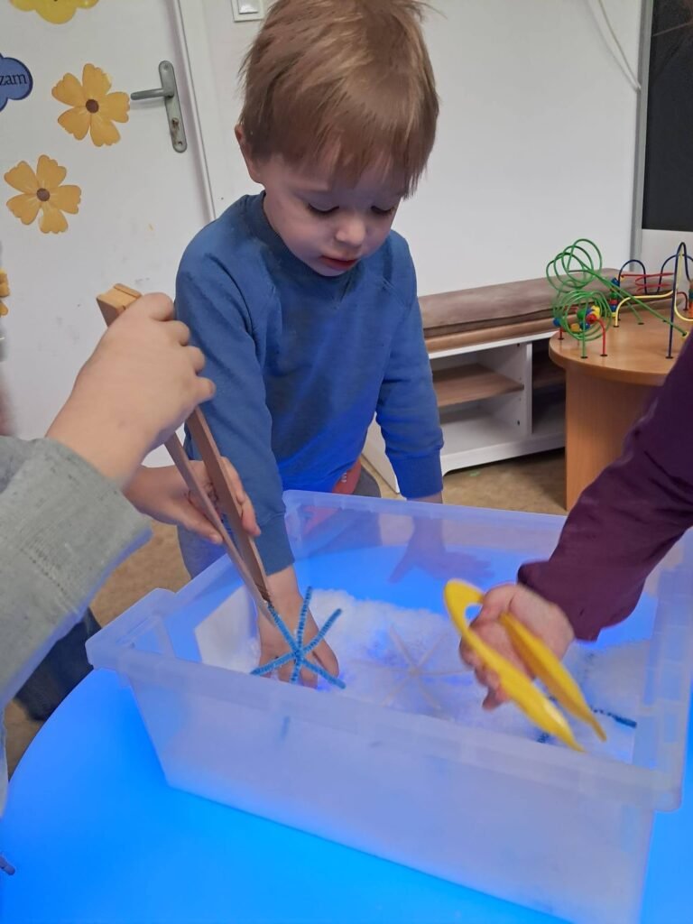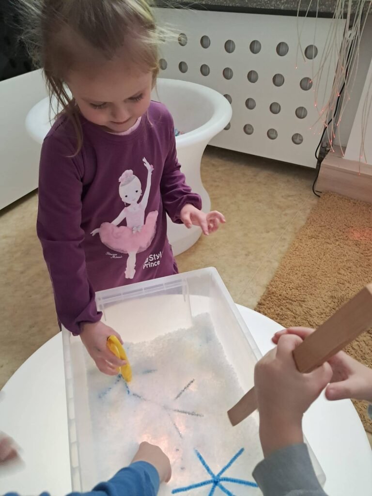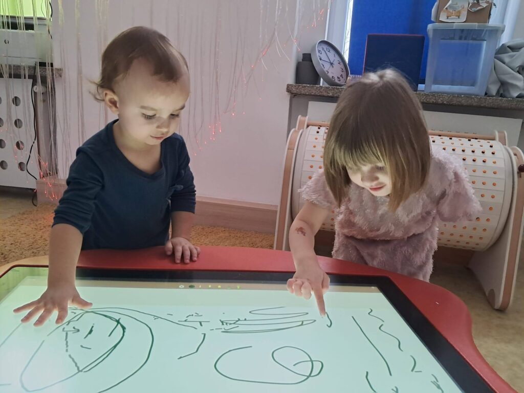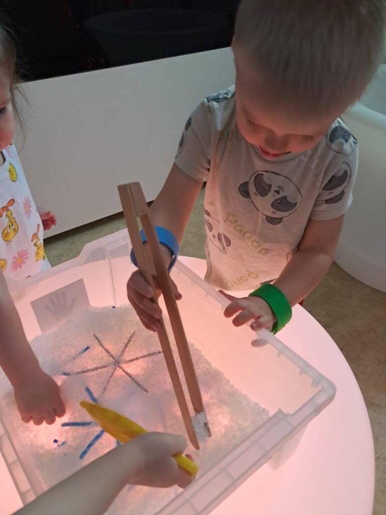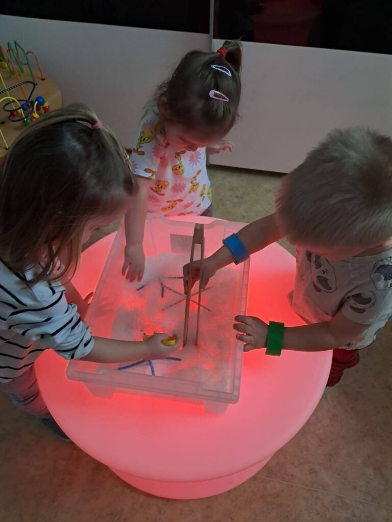 Sala Doświadczenia Świata to wyjątkowe miejsce, w którym dzieci mogą bezpiecznie odkrywać, doświadczać i rozwijać swoje zmysły. Podczas zajęć z integracji sensorycznej stymulujemy wzrok, słuch, dotyk, równowagę i czucie głębokie, wykorzystując światło, dźwięki, faktury oraz interaktywne elementy otoczenia. To przestrzeń sprzyjająca wyciszeniu, koncentracji, ale też swobodnej aktywności i radości z odkrywania. Zajęcia wspierają rozwój emocjonalny, motoryczny i poznawczy dziecka, pomagają regulować napięcie oraz wzmacniają poczucie bezpieczeństwa i sprawczości. Co najważniejsze – dzieci świetnie się bawiły! Było dużo uśmiechów, ciekawości i radosnego odkrywania świata wszystkimi zmysłami.