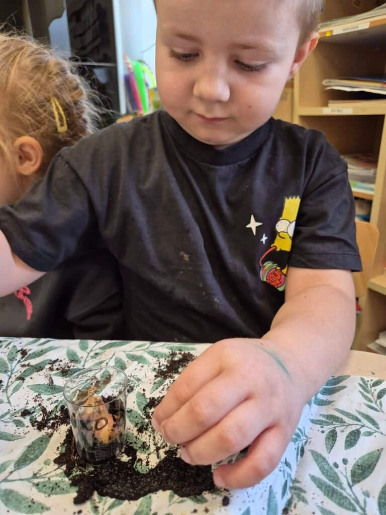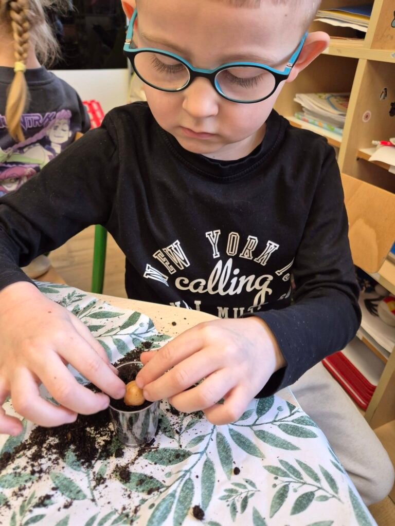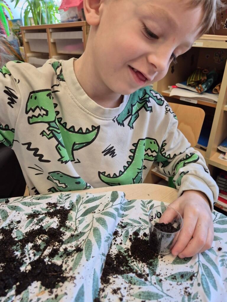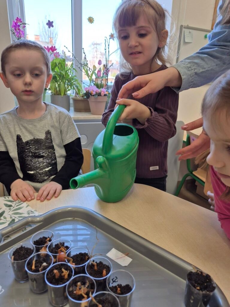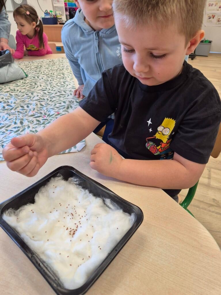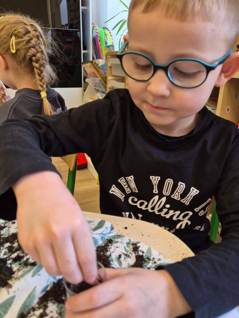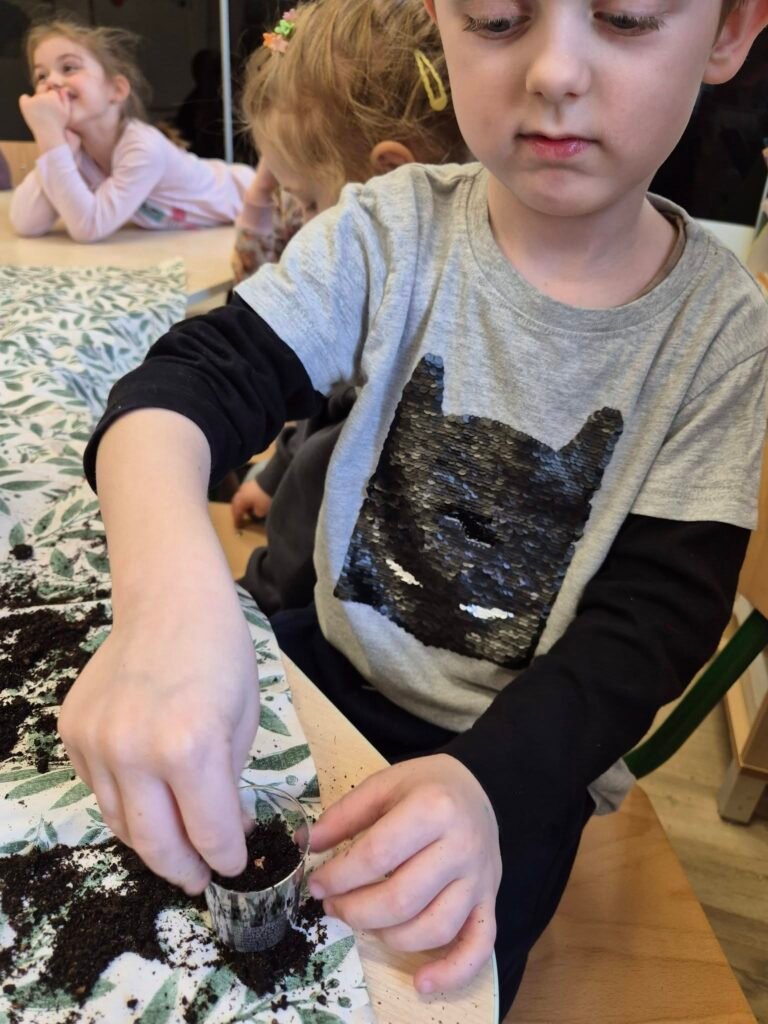 Podczas wspólnego sadzenia rozmawialiśmy o tym, czego rośliny potrzebują do wzrostu – słońca, wody i troskliwej opieki. Teraz każdego dnia będziemy obserwować, jak z małych nasion wyrastają zielone roślinki.