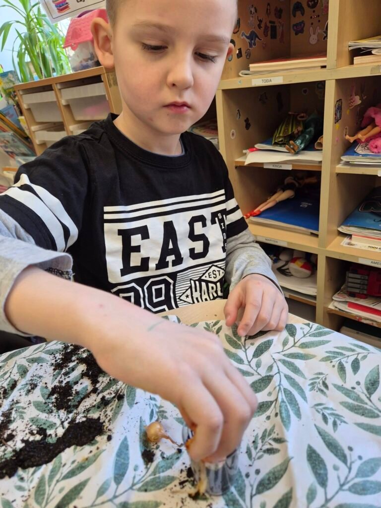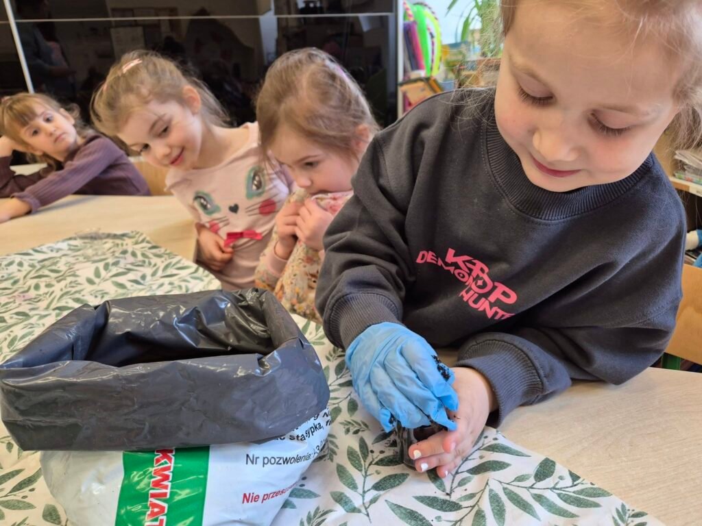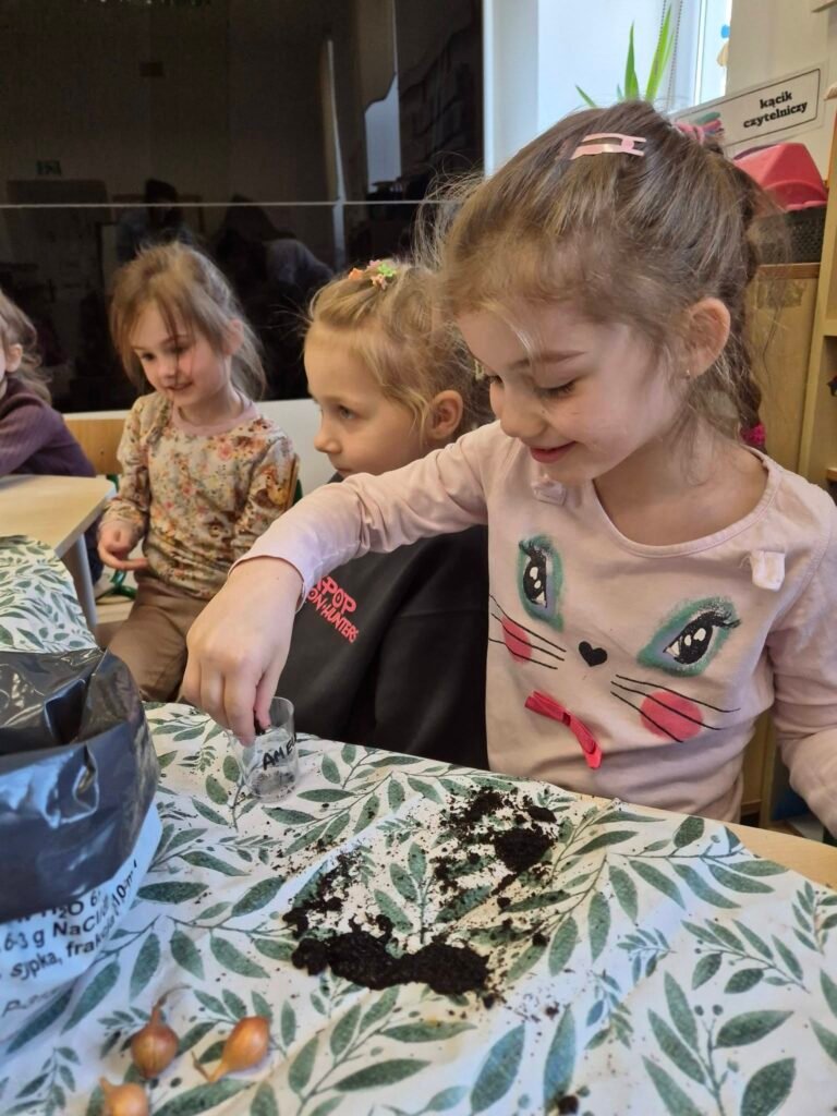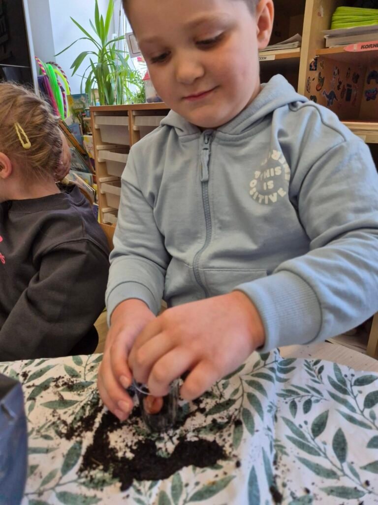 Dzieci z ogromnym zaangażowaniem sadziły dziś pierwsze wiosenne rośliny. Do doniczek trafiły nasiona rzeżuchy oraz cebulki, z których już niedługo wyrośnie pyszny, zielony szczypiorek.