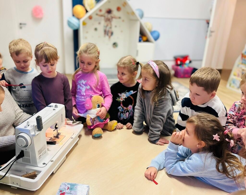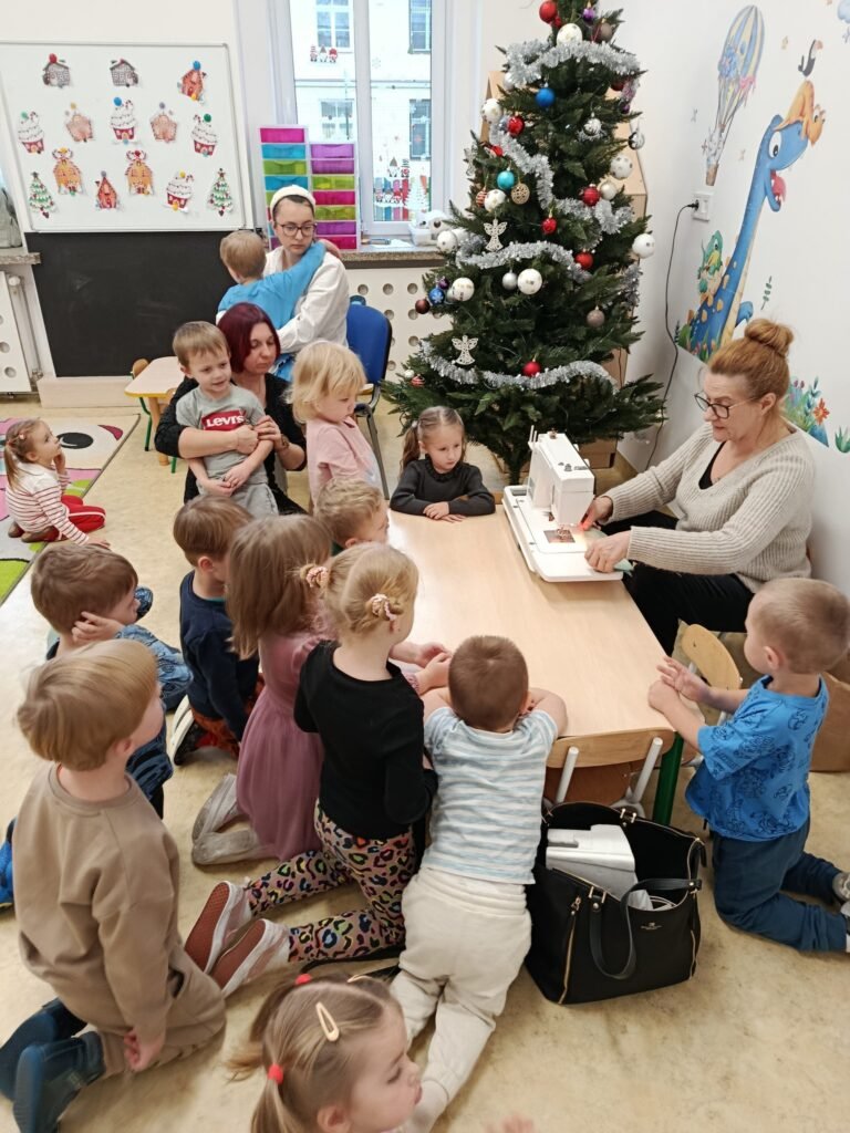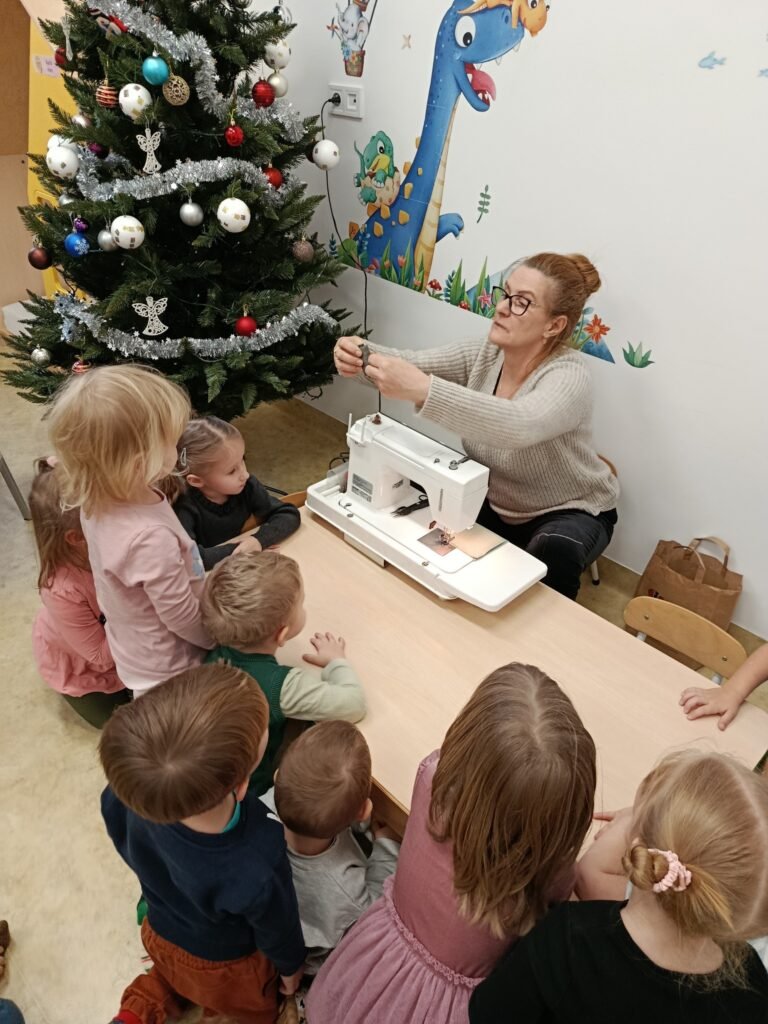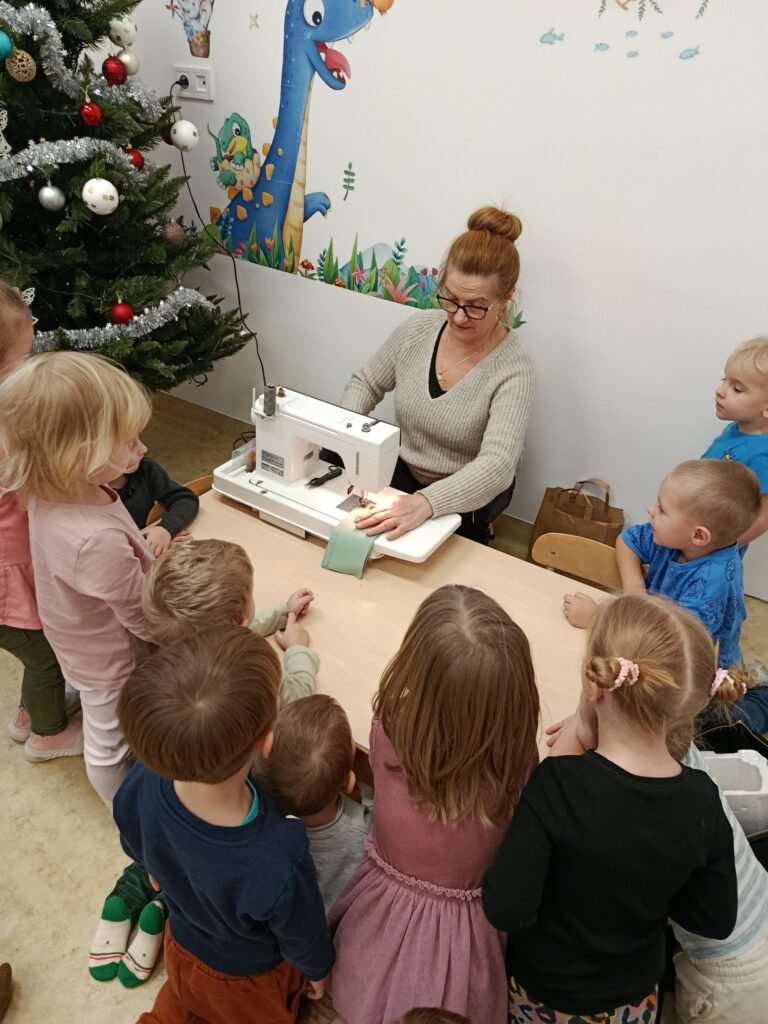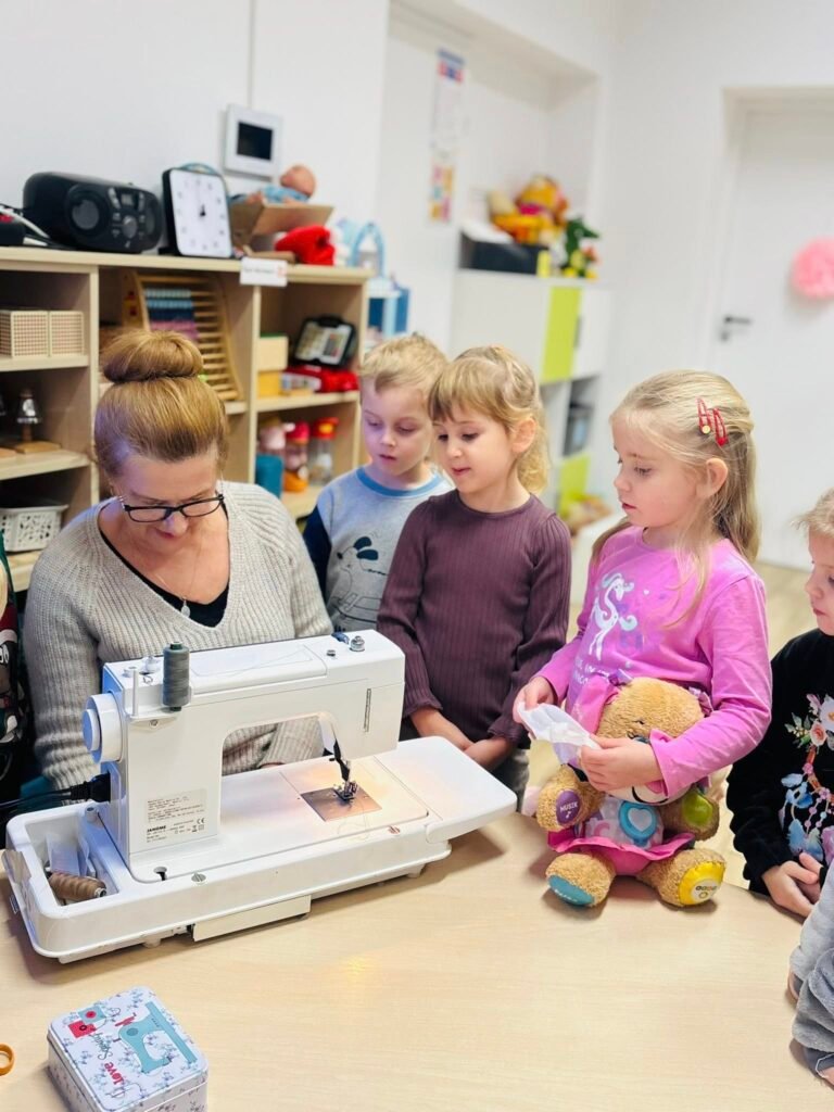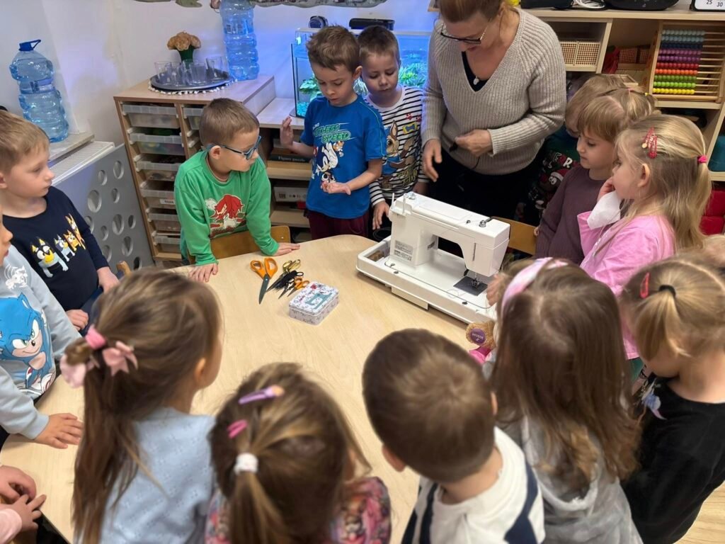 Dziś gościliśmy w naszym przedszkolu Panią Marysię, która z zawodu jest krawcową. To ona wprowadziła dzieci w tajniki swojej pracy. Przedszkolaki z wielkim zaciekawieniem oglądały różnej wielkości i koloru guziki, szpulki z nićmi oraz materiały krawieckie. Okazało się, że praca krawcowej, chociaż z pozoru przyjemna, wcale nie jest łatwa. Z całego serca dziękujemy za poświęcony czas i wspaniałe zajęcia