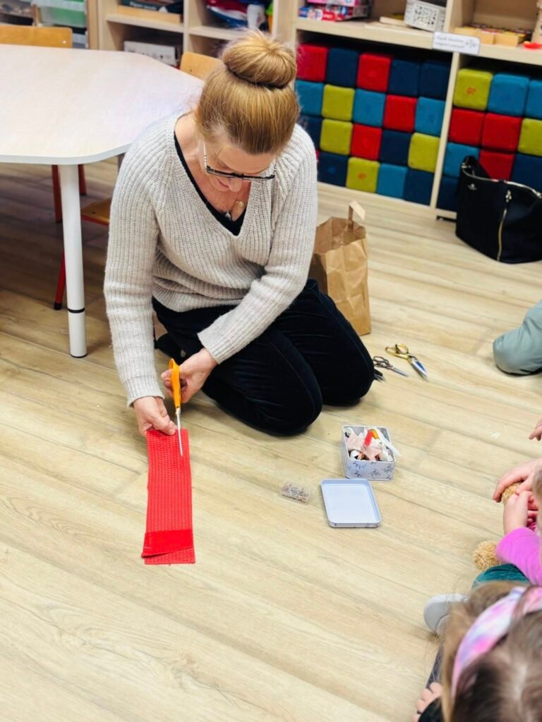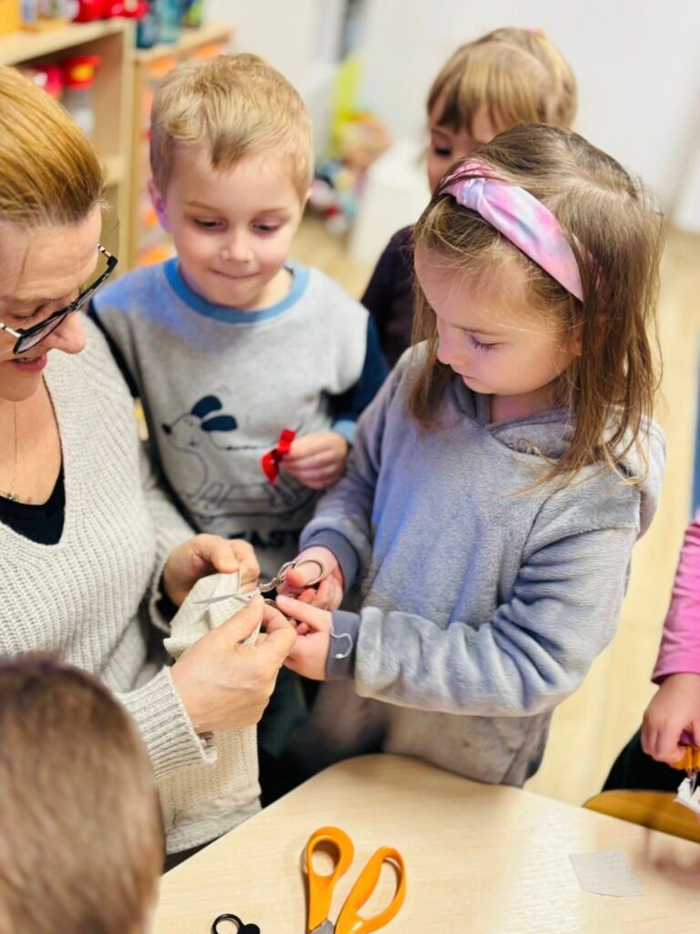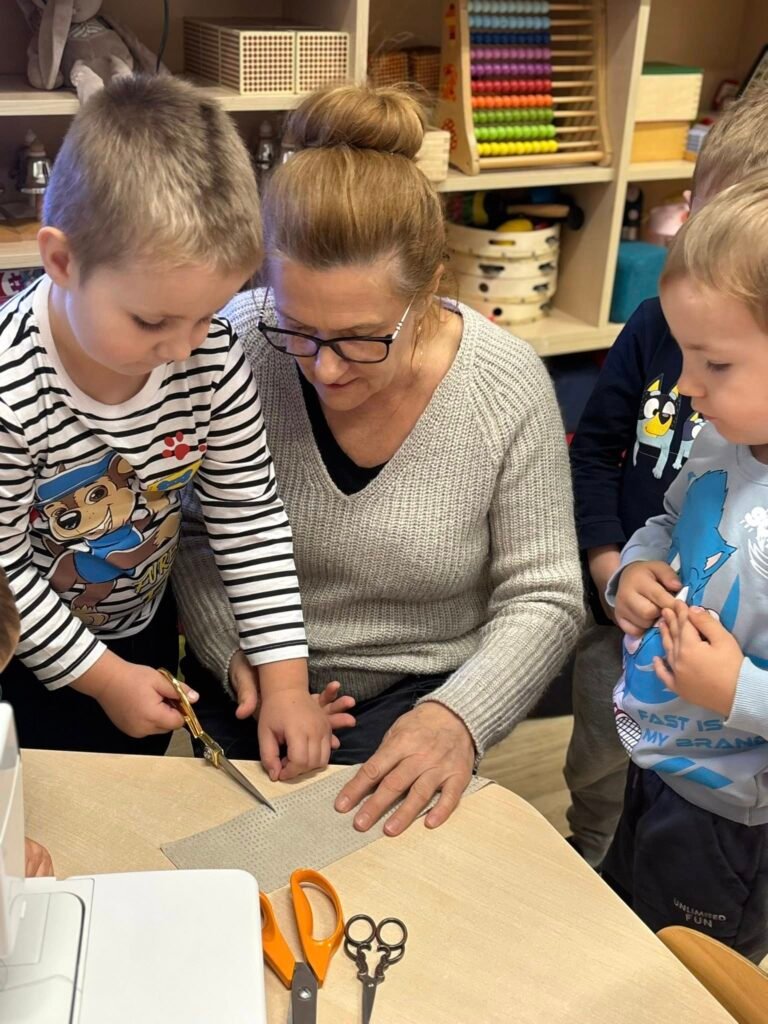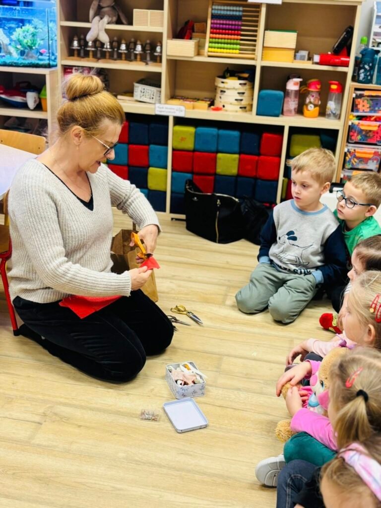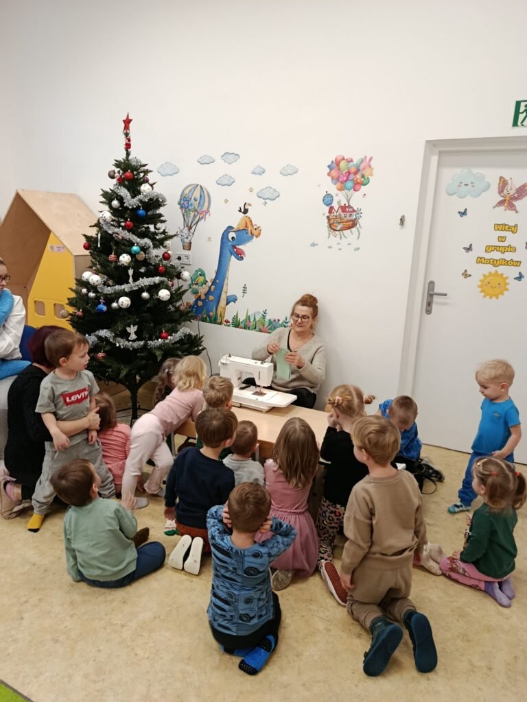 Dziś gościliśmy w naszym przedszkolu Panią Marysię, która z zawodu jest krawcową. To ona wprowadziła dzieci w tajniki swojej pracy. Przedszkolaki z wielkim zaciekawieniem oglądały różnej wielkości i koloru guziki, szpulki z nićmi oraz materiały krawieckie. Okazało się, że praca krawcowej, chociaż z pozoru przyjemna, wcale nie jest łatwa. Z całego serca dziękujemy za poświęcony czas i wspaniałe zajęcia