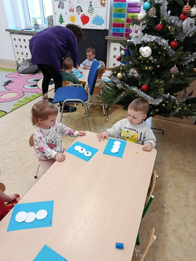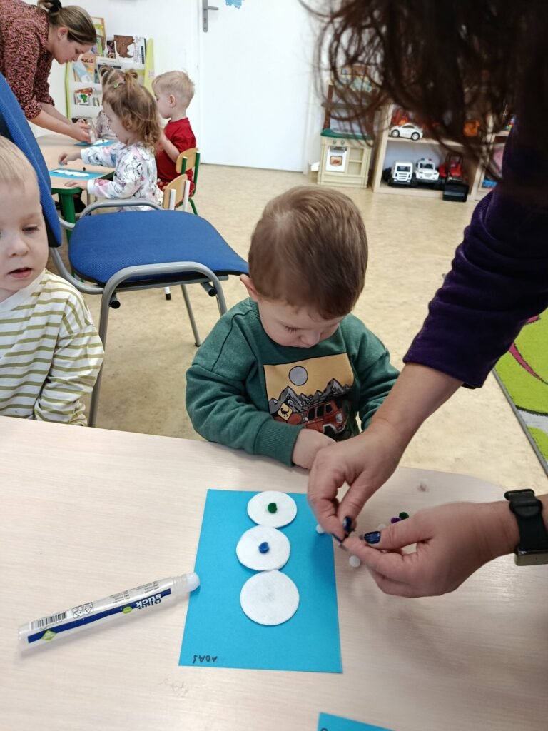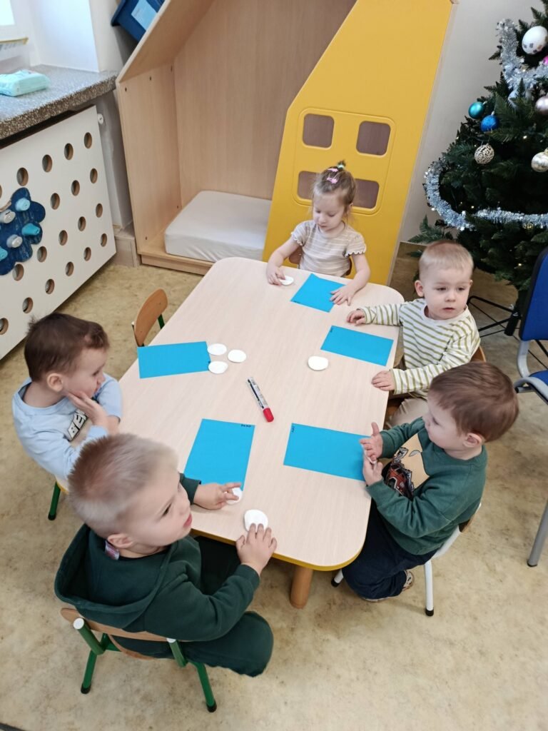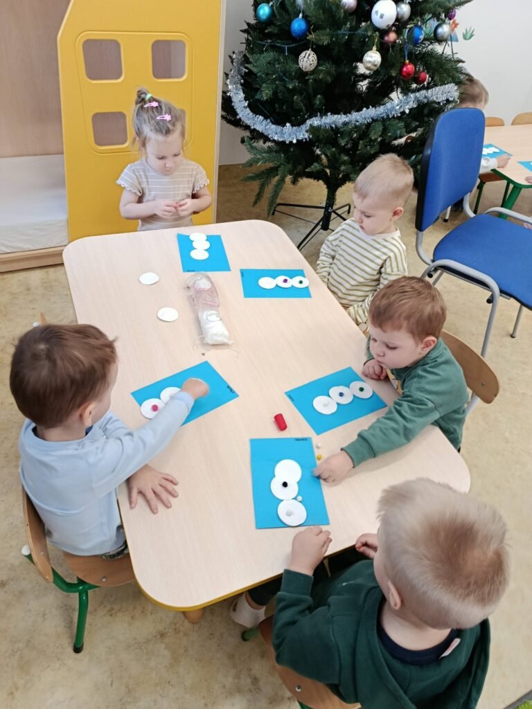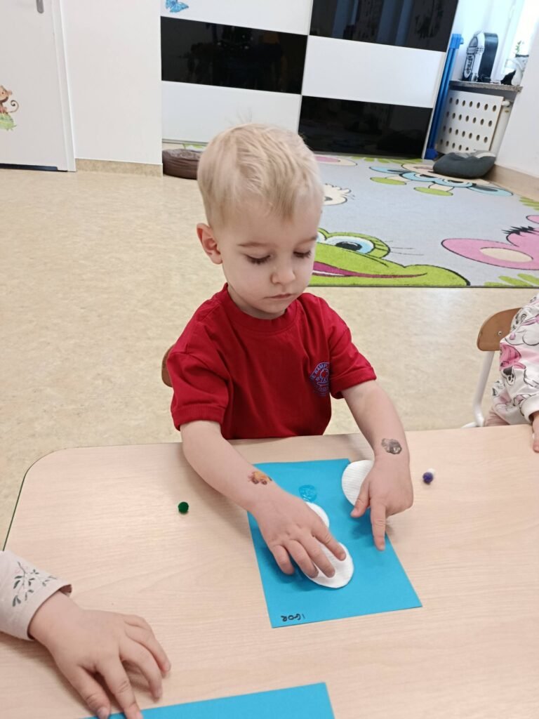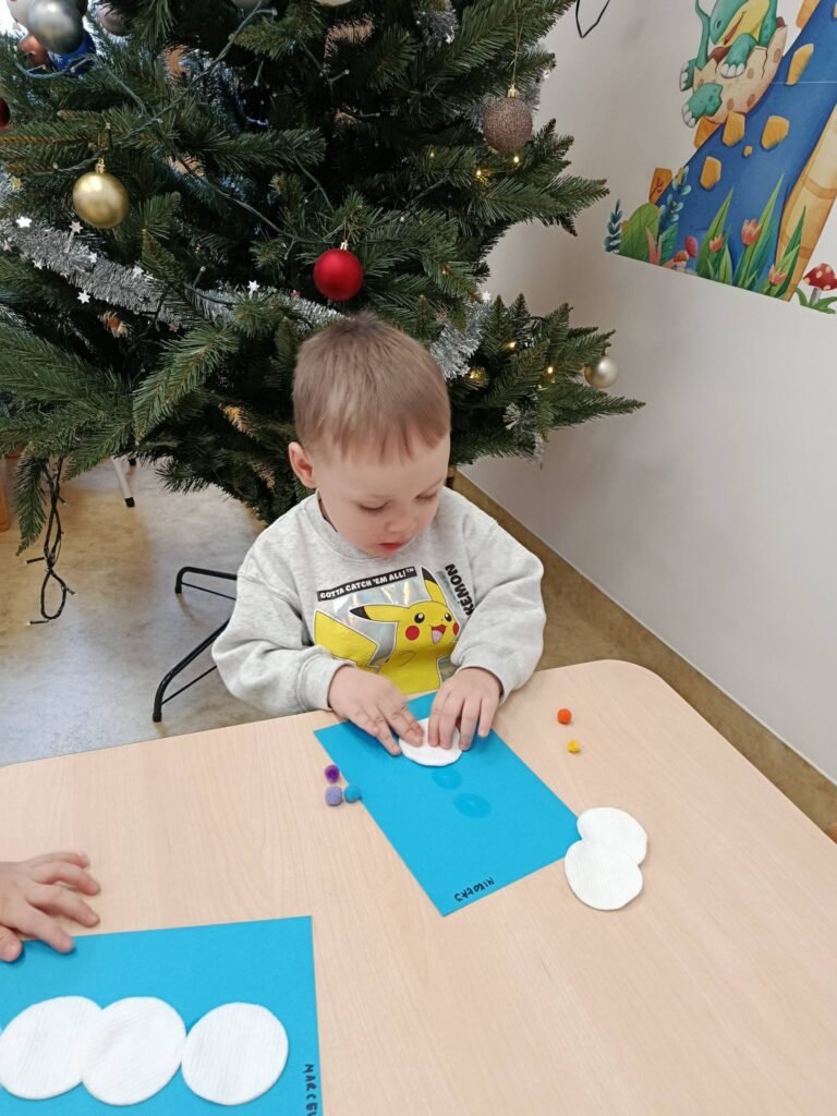 Dzisiaj Biedronki i Motylki tworzyły zimowe bałwanki. Zajęcia doskonale wspierały rozwój motoryki małej – ćwiczyły sprawność paluszków, koordynację ręka–oko oraz precyzję ruchów. Dzieci miały również okazję do poznawania różnych faktur, co stymulowało zmysł dotyku i rozwijało integrację sensoryczną.
