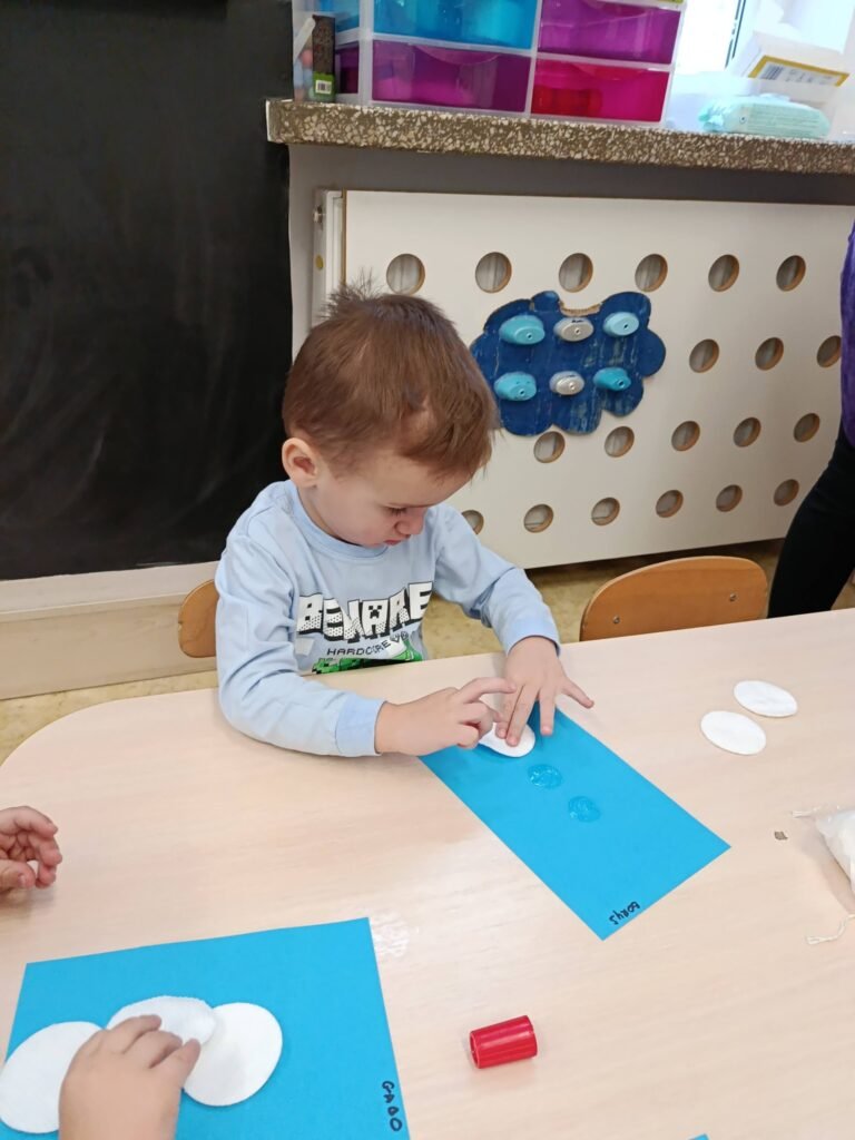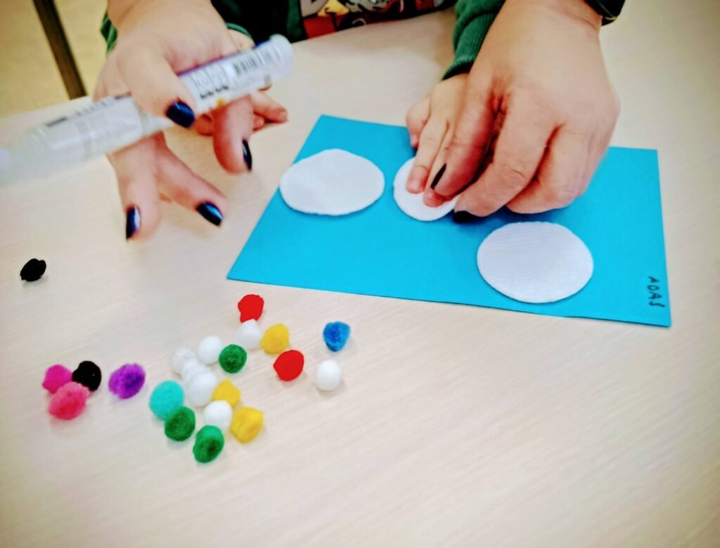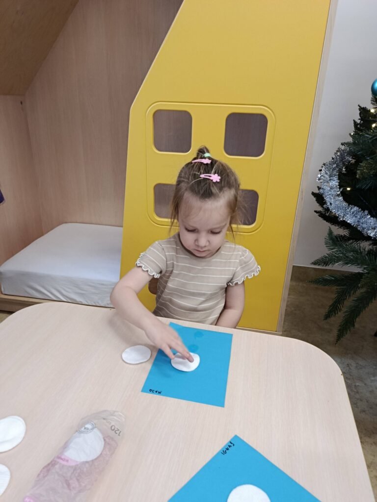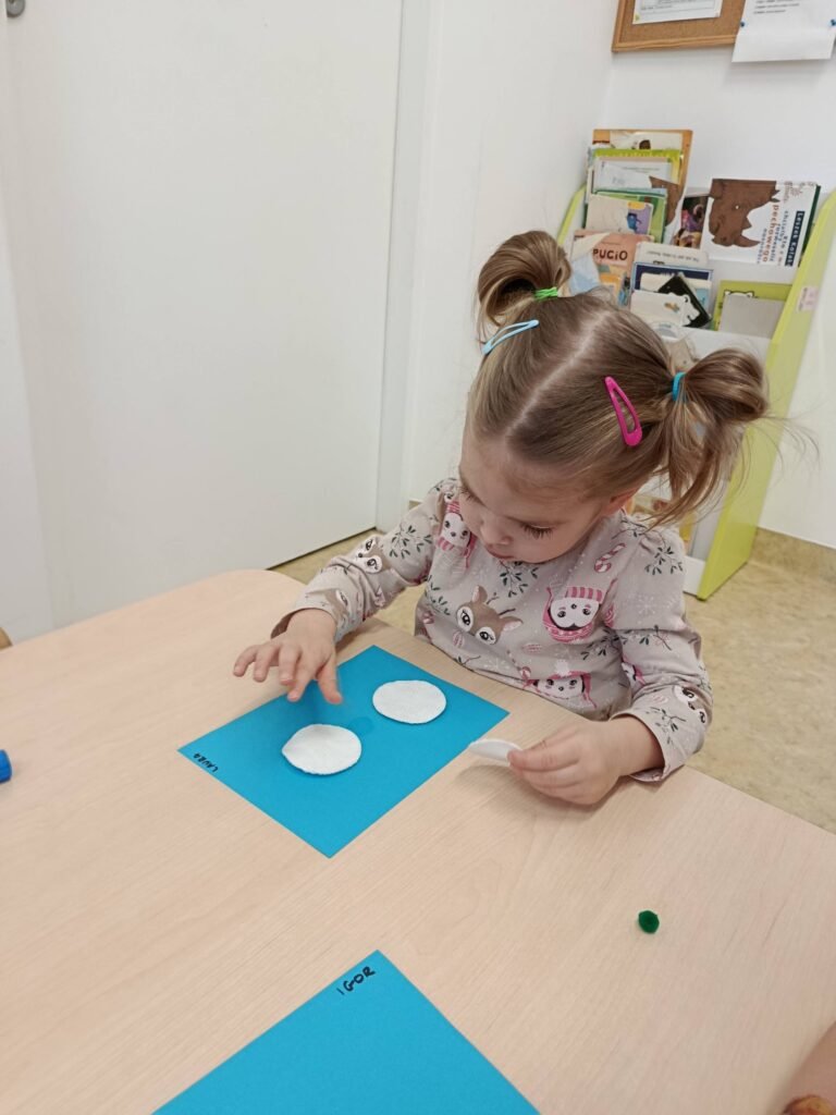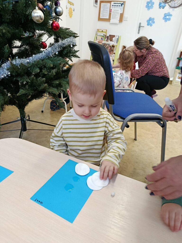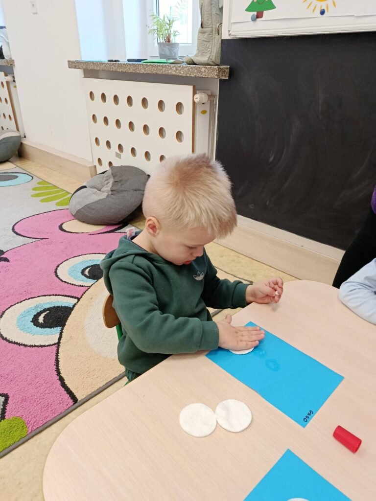 Dzisiaj Biedronki i Motylki tworzyły zimowe bałwanki. Zajęcia doskonale wspierały rozwój motoryki małej – ćwiczyły sprawność paluszków, koordynację ręka–oko oraz precyzję ruchów. Dzieci miały również okazję do poznawania różnych faktur, co stymulowało zmysł dotyku i rozwijało integrację sensoryczną.